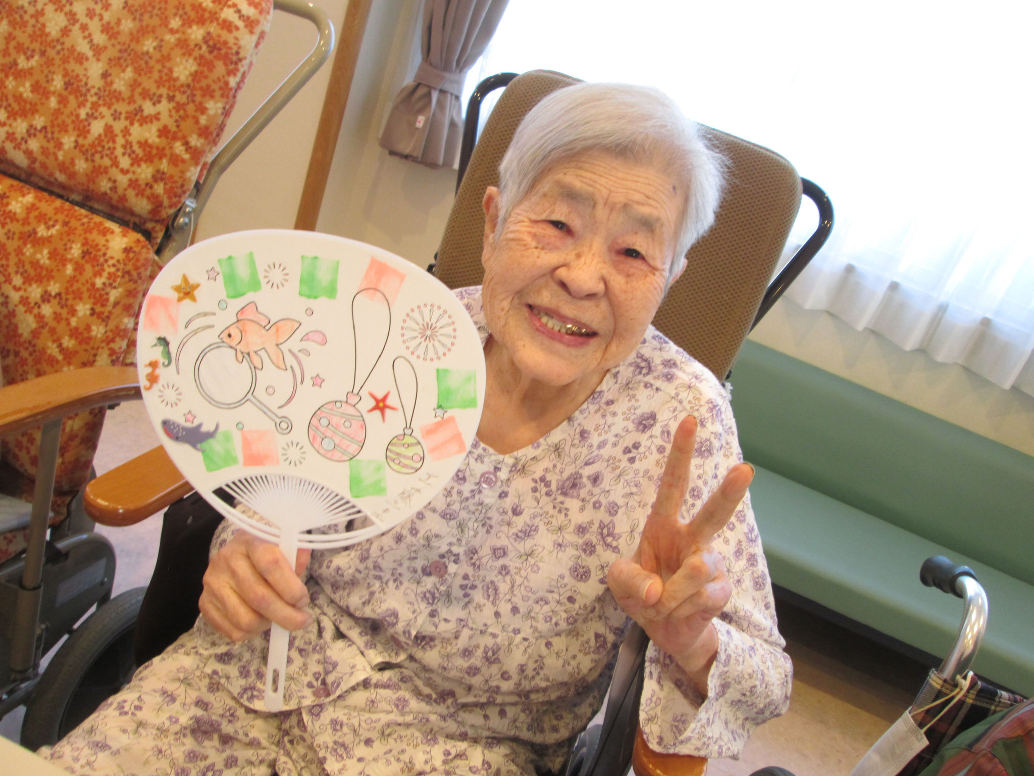 うちわ作り 7月のレクリェーションでうちわ作りを行いました。 参加された入居者の皆様には、思い思いのうちわを作成していただきました。 このうちわを使って、まだまだ続く猛暑の日々を一緒に乗り切って いきましょう!